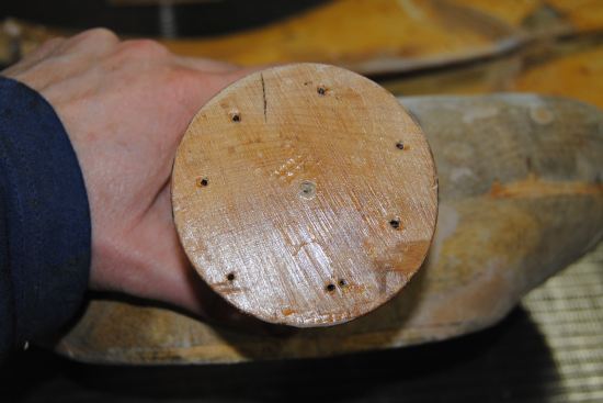 Since it isn't an integral part of the fork, how did they attach it? Well, there is a dowel visible at the bottom of the fork, so they drilled a hole in the fork to connect the horn. (Holes are always weak spots...) But the dowel end is smaller than the horn cap, and if you look closely, the wood in the dowel is not the same wood as in the horn...