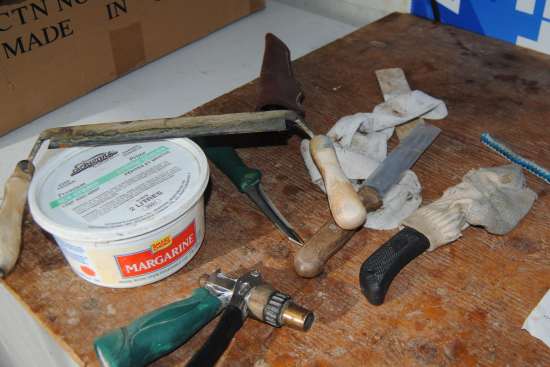 Move on over to where Rod pounds the trees and you find a few more hanging round behind the band saw where he can reach them easily. If the trees take a while to dry they can get a little slimy, especially behind the cantle. So old socks are the perfect thing to use to wipe off that area and get the hide drying faster. There were only two socks there today. Sometimes he has four or more in different stages of drying, depending on the weather and humidity levels which affect drying times.