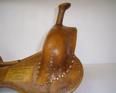 The High Country pattern was developed by the late Matt Eberle, a well respected maker of cowboy rigs from High River, Alberta. His original pattern, moderate top slope and no undercut on the sides, was developed so that he could easily cover it without a welt. It was designed to be 12 ½” wide, though even Matt modified that on his orders, and designed to be a stood up fork. We have made them from 11” to 13” wide, with most stood up but the occasional one leaned ahead. A wood post horn on a High Country is a pretty common order.