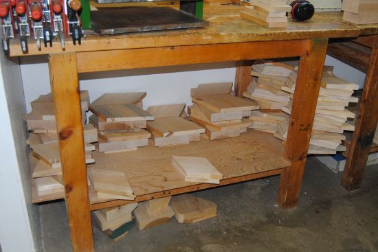 While I glue up the cantles and bars specifically for each order, I can glue up standard sizes of forks ahead of time. I normally have a stock of laminated forks for metal horn slick forks, 12", 13", and 14" metal horn forks and Wade forks under the bench. (Orders in the 1/2" sizes or something like the 15" wide fork are glued up special at the time of their orders.) As you can see, this month has lowered my stock of metal horn forks while the Wades on the right are full up.