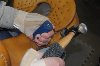 and gave us this section of foam tubing. The nail set is tightly held inside it, and that extra diameter makes a world of difference to the amount of pressure you have to exert to hold it steady. The larger diameter can make seeing difficult sometimes, but Rod can work around that. The pain reduction is significant with this little trick. Sure makes us wonder if these types of things would be helpful for our saddle making customers who spend hours and hours holding small diameter tools while they hit them with hammers of various types.