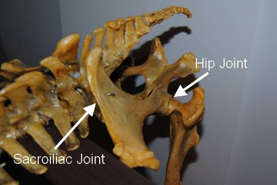 When we talked about the front leg, we said there was no defined pivot point because the whole leg is attached by muscle, so the shoulder blade moves around a bit against the chest. The hind leg is different because it is attached solidly – leg to pelvis at the hip joint, and pelvis to spine at the sacroiliac joint.
